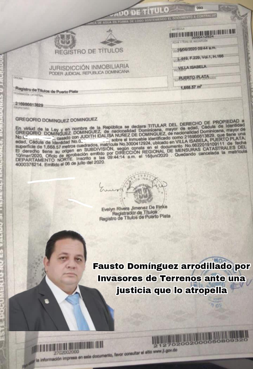 El Diputado Fausto Dominguez justifica todos sus derechos en esta propiedad mediante el Certificado de Titulo matricula 3000412924 Designación Catastral 216986613829 con una extensión superficial de 1,668.57 metros cuadrados, del municipio de Villa Isabela, provincia Puerto Plata emitido en fecha 06 de julio del 2020.-
