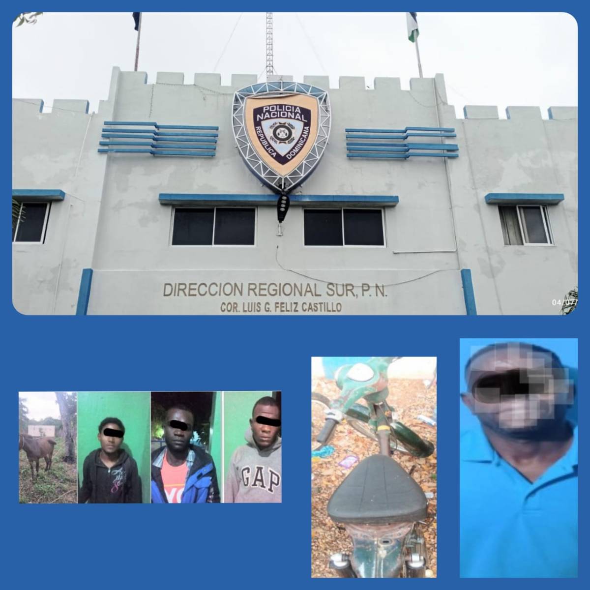 PEDERNALES; Miembros de Nuestra Policía Nacional apresaron en la loma las Mercedes de esa provincia a los nombrados, ELOIN JACKSON, ALEXANDER CARRASCO Y ALFREDO MATOS de 28,22 y 20 años de edad residentes en los Cocos del Municipio Enriquillo, a los cuales los agentes policiales le ocuparon dos (2) Mulas y un Mulo con estampa AF53, ACT Y JFF, los cuales estos desaprensivos sustrajeron en propiedades privadas en la comunidad de arroyo Dulce.