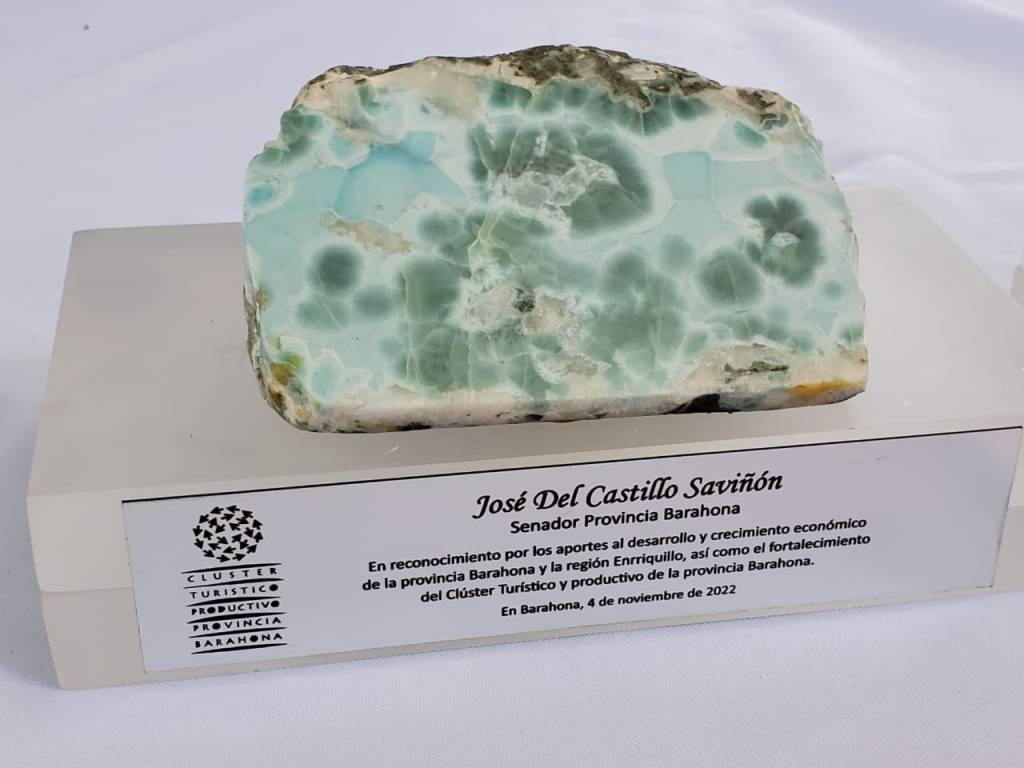 El senador de la provincia Barahona, José Del Castillo Saviñón, recibió la distinción por parte de la gobernadora Diones González; Virgilio Pérez Bernal y Rafael Mendez Risk, presidente y vicepresidente del Clúster.