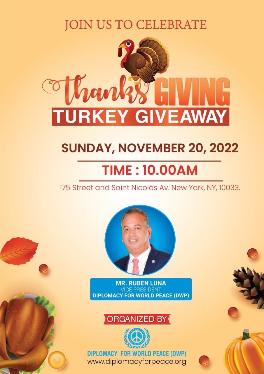 NUEVA YORK, EUA. -El vicepresidente de la organización Diplomacia por la Paz Mundial, Rubén Luna, estará encabezado la entrega de pavos con motivo de la semana de Acción de Gracias, este domingo 20 de noviembre del corriente, desde las 10:00 a.m en la intercepción formada por la calle 175 y la Avenida Saint Nicholas, Alto Manhattan, en esta ciudad.