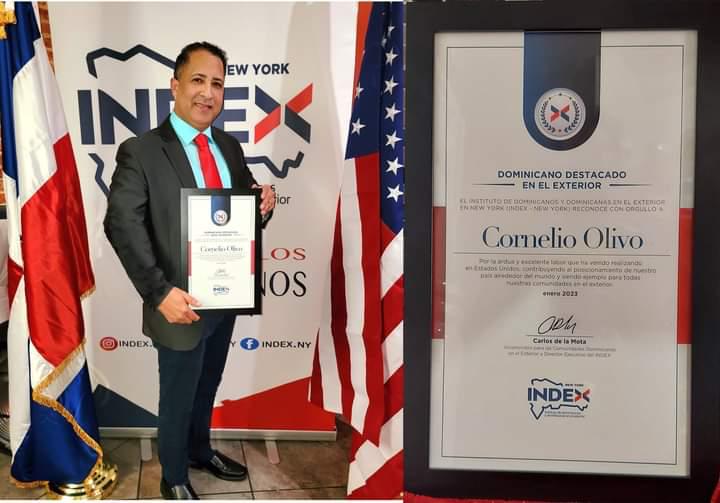 Nueva York; EUA. -El Instituto de dominicanos y dominicanas en el exterior ( INDEX ) reconoció al comunicador, Cornelio Olivo, por la labor que ha venido realizando en Estados Unidos de America, a travéz de sus reportajes noticiosos llevados a ámbitos nacionales e internacionales.