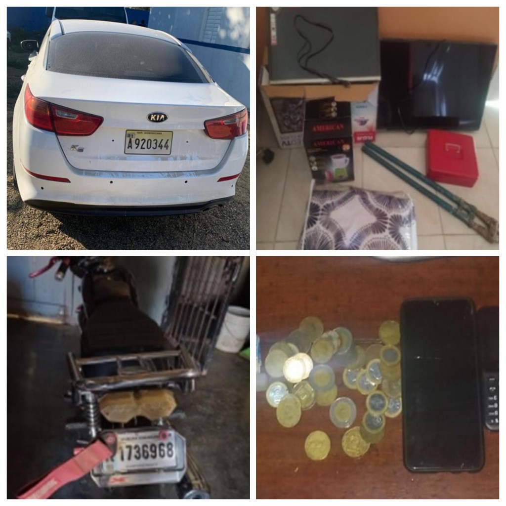 Mao, Valverde.-Miembros preventivos y de investigaciones criminales apresaron en flagrante delito a dos personas y recuperaron un carro, una motocicleta, dos televisores plasmas y dos celulares, entre otros objetos, sustraídos en los municipios de Esperanza (Valverde), San Fernando de Montecristi y Dajabón.