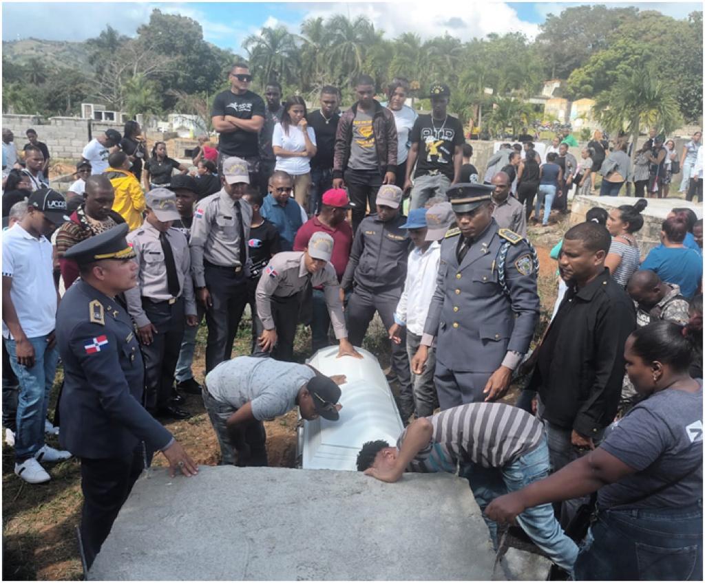 Una comisión de oficiales y compañeros de arma, designada por la Dirección General de la Policía Nacional, bajo la coordinación del director regional Noroeste, de dicha institución, dieron el último adiós al malogrado agente, en el cementerio Los Camarones, de la comunidad La Sabana de Yamasá, de donde era oriundo.