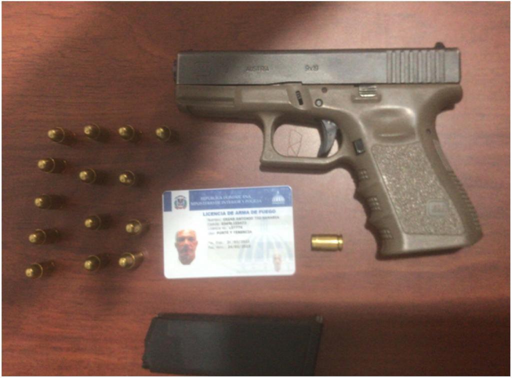 Los investigadores policiales tienen en su poder el arma utilizada, una pistola marca Glock, calibre 9mm., serie KCT010, con su cargador conteniendo doce cápsulas, amparada con licencia de porte y tenencia del Ministerio de Interior y Policial.