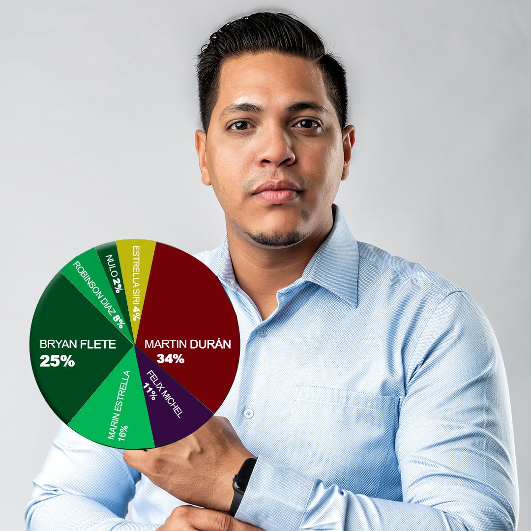 se obtienen los siguientes resultados: Martin Durán 34%, Bryan Flete 25%, Marin Estrella 16%, Robinson Díaz 8%, Estrella Siri 4% y votos nulos 2%.
