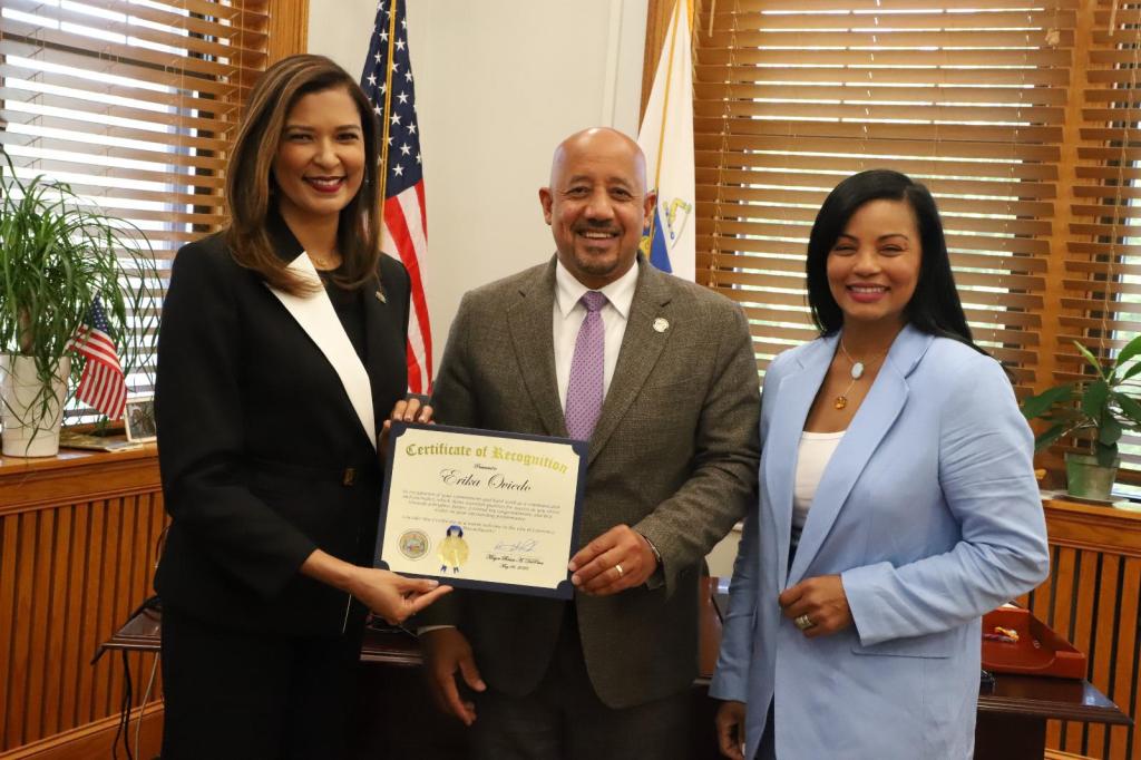“El Ayuntamiento de Lawrence le da la bienvenida a Erika Oviedo y por la presente celebra y reconoce sus logros personales y profesionales y le extiende todos sus buenos deseos de éxito continuo en el futuro”, leyó Rodríguez en la citación.