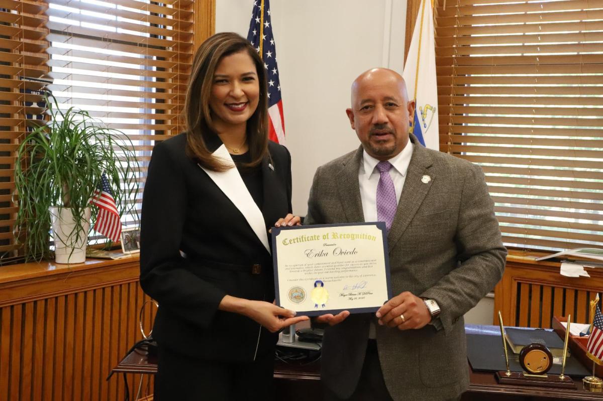 Lawrence, MA.- De manos del alcalde Brian De Peña, la alcaldía de esta ciudad entregó un reconocimiento a la comunicadora y periodista dominicana Erika Oviedo, quien estuvo visitando la ciudad con una agenda de actividades con la finalidad de estrechar lazos y aportar al desarrollo de los profesionales de la comunicación de esta localidad.