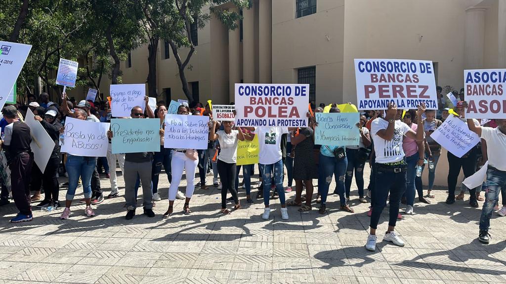 Santo Domingo.- La Federación Nacional de Bancas de Lotería realizó este jueves una manifestación frente al Palacio Nacional exigiendo el cumplimiento del protocolo suscrito entre el Ministerio Público y el Ministerio de Hacienda, que a pesar de cumplirse un año y cuatro meses de la promulgación del decreto 63-22 que dio inicio al proceso de legalización de bancas de lotería, se ha mantenido un incremento constante en la colocación de bancas, posterior al cierre del proceso de inscripción.