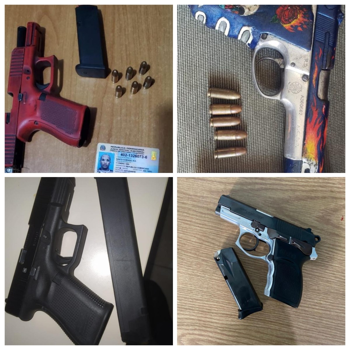 Danario Santos, se le ocupó el revólver ilegible, serie 75455, Gerald Alonso Villaman, pistola marca Glock, calibre 40, serie No. GDC7085; a Cristian Aneury Díaz Arvelo quien tenía en su poder la pistola marca Glock, calibre 9, serie No. RWC104, mientras que a Johan Alexander Valdez se le ocupó la pistola S&W, serie LJF2044, calibre 9.