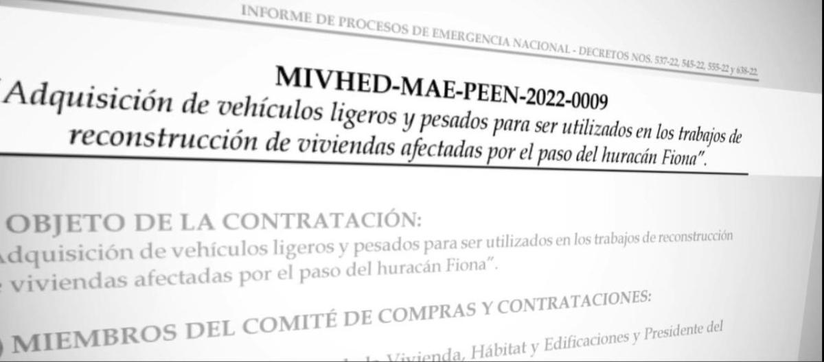 Otro proceso cuestionable es el MIVHED-MAE-PEEN-2022-0009, para la “adquisición de vehículos ligeros y pesados para ser utilizados en los trabajos de reconstrucción de viviendas afectadas por el paso del huracán Fiona”.