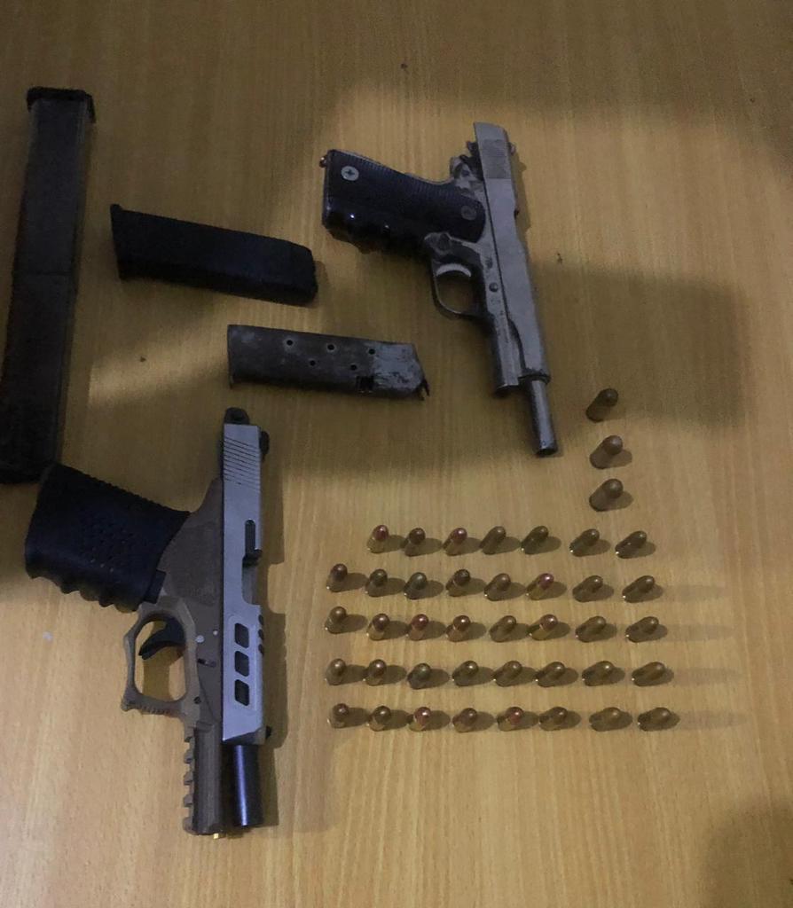 Las armas ocupadas son la pistola Glock, serie No. BEGT766, con dos cargadores para la misma, uno de 30 y otro de 18, con 39 capsula 9mm, y la pistola 45, con marca y numeración ilegibles, con su cargador y tres cápsulas.