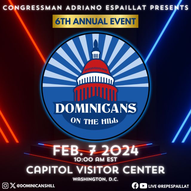 NEW YORK. -Los quisqueyanos en esta ciudad estarían sumándose a la sexta versión anual de “Dominicans on the Hill” ( Dominicanos en el Capitolio) que encabeza el congresista federal de origen santiguero, Adriano Espaillat, que se llevará a cabo en vivo y en persona el miércoles, 7 de febrero de 2024, en el Auditorio del Centro de Visitantes (CVC) del Capitolio de los Estados Unidos, en Washington, DC.