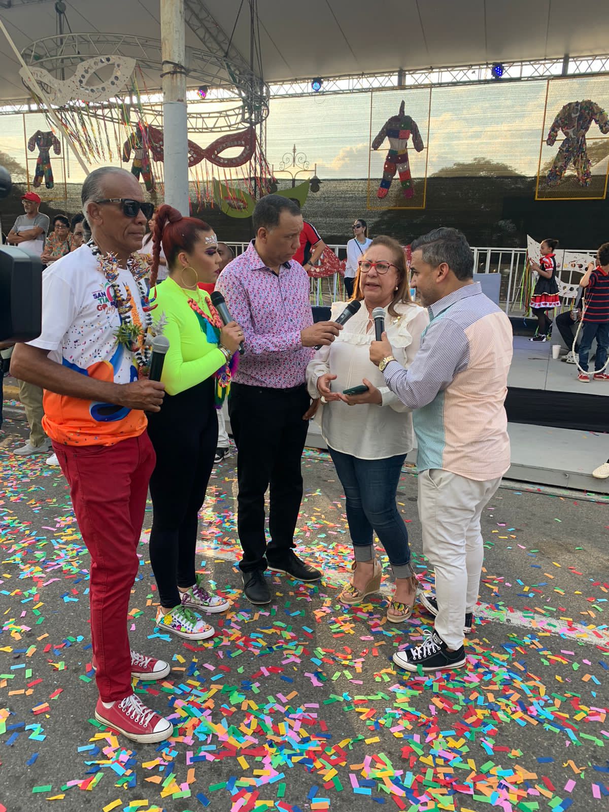 La gobernadora de Santiago, doña Rosa Santos, se confundió entre los grupos de lechones y comparsas, para dar la formalidad a la gran fiesta carnavalesca.