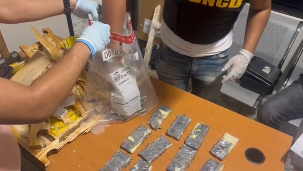 En presencia de un fiscal se procedió a abrir la caja, encontrando dentro una mesa de jugar dominó, en cuyos laterales se ocuparon 16 láminas de cocaína, incrustadas entre la madera, con un peso aproximado a los dos kilogramos.