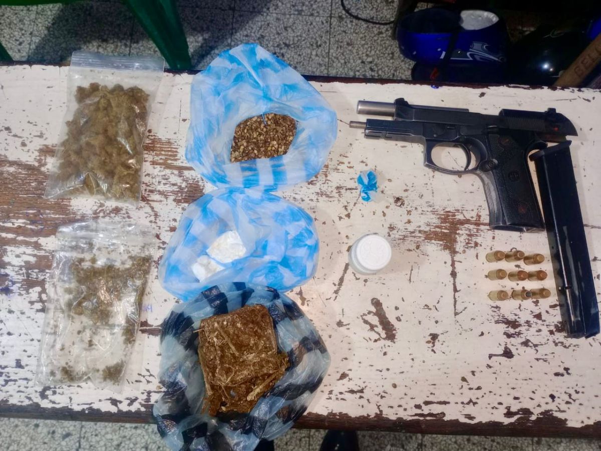 Durante la intervención se le ocupó una pistola Pietro Beretta, calibre 9mm con un cargador de 30 con 9 cápsulas, cuatro chalecos antibalas, dos balanzas, 26 pastillas presumiblemente éxtasis, una porción de presunta marihuana con un peso de 142.7 gramos, así como también varias porciones de cocaína y crack.