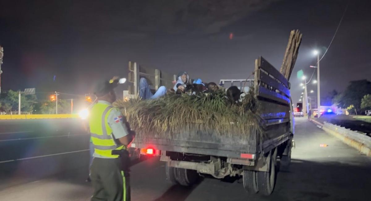El camión Mitsubishi, color blanco, placa no visible, que fue detenido por faltarle una luz trasera, en las inmediaciones del peaje de Las Américas, transportaba en la cama del camión camuflajeado de pajas, varios indocumentados de nacionalidad haitiana.