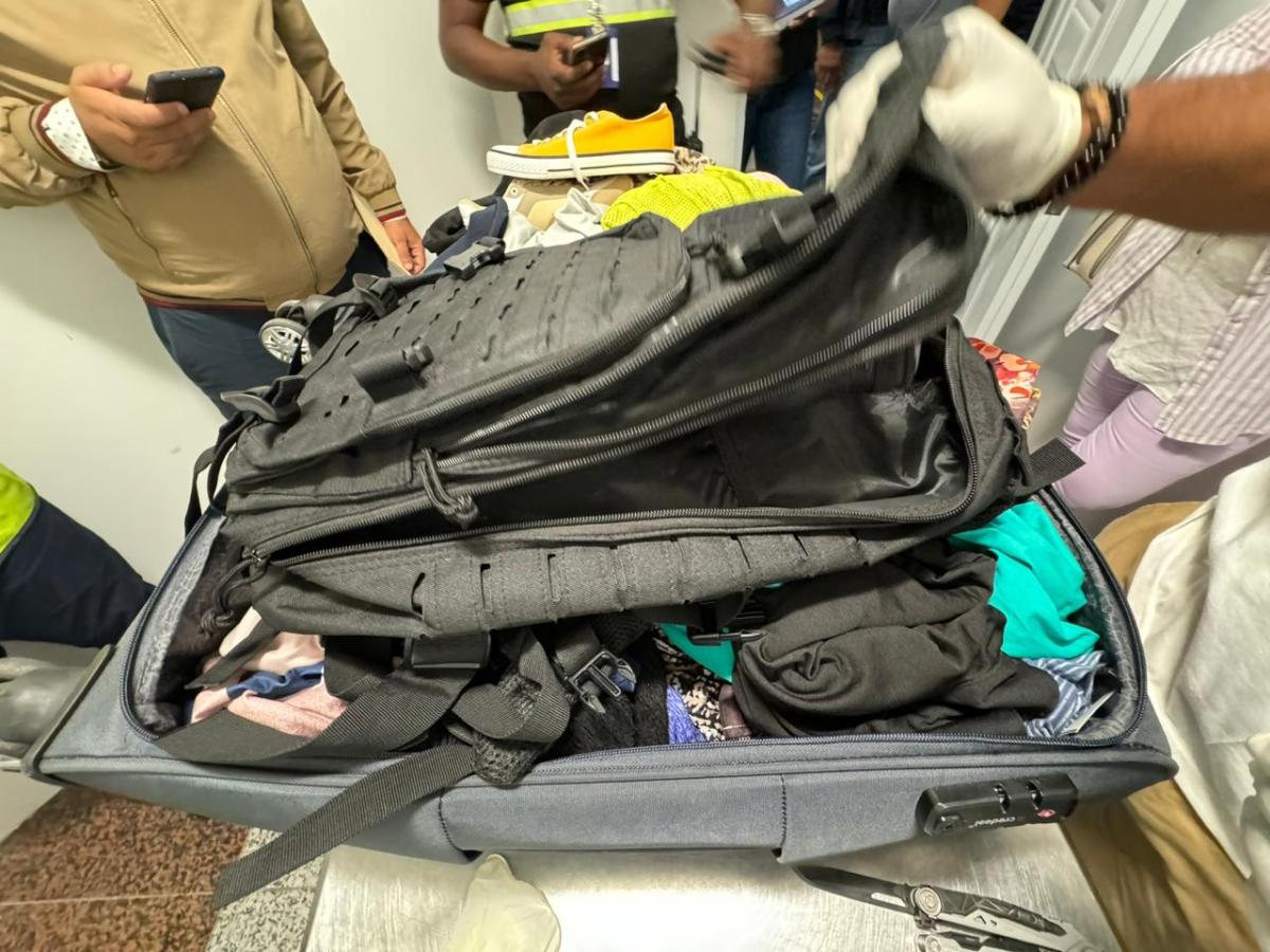Por instrucciones del fiscal y en presencia de la pasajera, se procedió a abrir la maleta, encontrando dentro una mochila con un doble fondo, conteniendo los dos paquetes de la sustancia, con un peso superior a los cuatro (04) kilogramos.