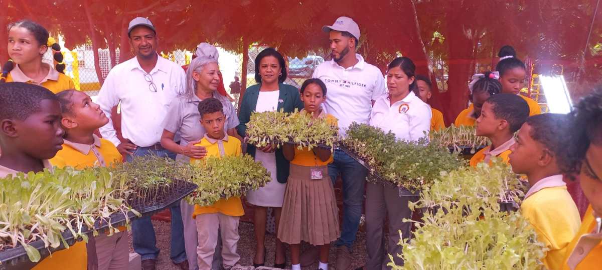 Villa Bisonó.-Con el objetivo de fomentar la educación ambiental y el desarrollo sostenible a través del cultivo de alimentos saludables en centros educativos de este municipio, una comisión del Ministerio de Agricultura realizó el lanzamiento de los Huertos Escolares con la entrega de hortalizas a la escuela Claridilia Cepín y otros centros.