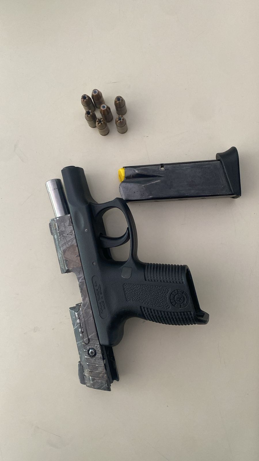 Durante la requisa, se les incautó una pistola marca Taurus, serie No. TCS15742, con su cargador y siete cápsulas, sin ningún tipo de documentación. También se encontró una funda con una gorra, una chaqueta con identificación del DICRIM y un pasamontañas.