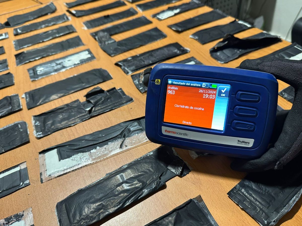 “La droga, envuelta en papel carbón, fue hallada en un doble fondo dentro de los recordatorios forrados con cinta pegante, otra modalidad de los narcotraficantes para tratar de burlar los controles de vigilancia y seguridad en las terminales del país”.