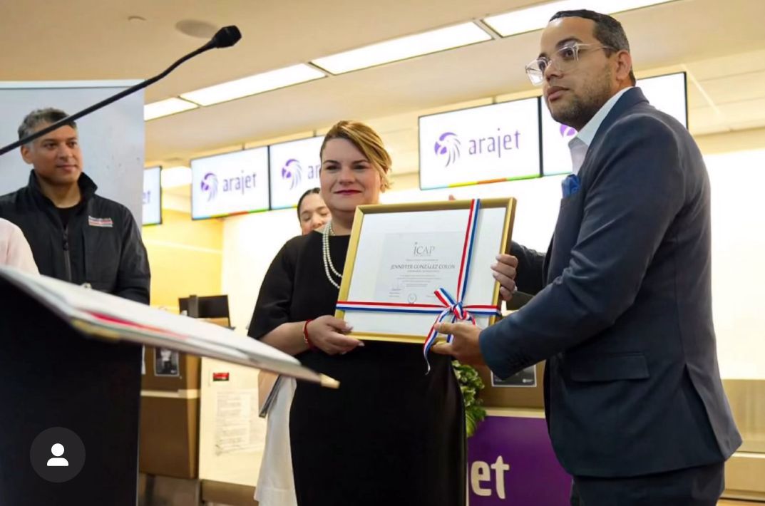 La gobernadora de Puerto Rico Jennifer González Colón, recibió un reconocimiento de parte del Instituto de Capacitación Política Jurídica y Social (ICAP), de manos de su director Máximo Miñoso, por el gesto de solidaridad con República Dominicana en el momento de la tragedia del Jet Set.
