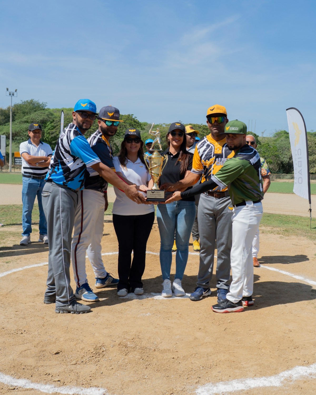 La licda. Hernández se hizo acompañar de la Licda. Sandra Sandoval gte. Recursos Humanos, Christian Pérez, Germán Anaya y Rafael Fernández para entregar la Copa Cementos Cibao a disputarse en este torneo.