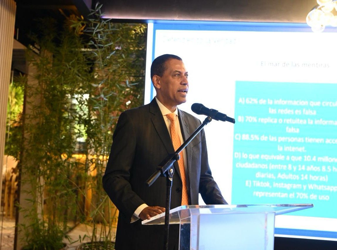 En un encuentro que sostuvo con comunicadores de Santiago, explicó que el 62 % de la información que circula en las plataformas digitales es falsa y que más de 10 millones de dominicanos están expuestos diariamente a datos manipulados a través de TikTok, Instagram y WhatsApp, que concentran el 70 % del tráfico informativo.
