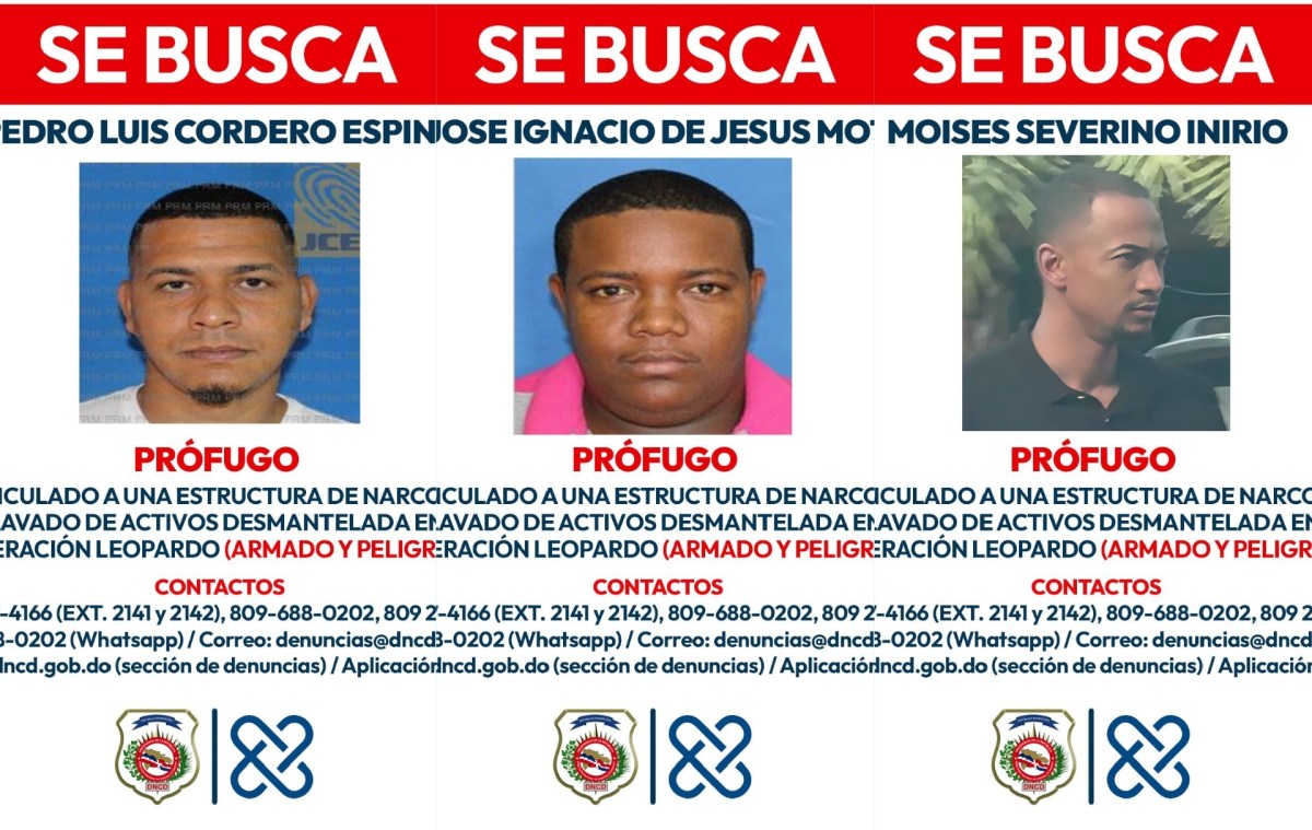 Santo Domingo.- El Ministerio Público y la Direccion Nacional de Control de Drogas (DNCD) emitieron este domingo una alerta de búsqueda y captura contra tres hombres, señalados como cabecillas de una red de narcotráfico internacional y lavado de activos, desmantelada a través de la Operación Leopardo.