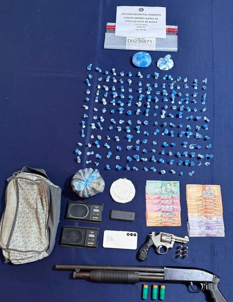 Además se incautó un revólver calibre 38, con varias cápsulas, una escopeta, una radio de comunicación, 05 celulares, RD $3,000 pesos en efectivo, dos tijeras y varios paquetes de fundas plásticas.