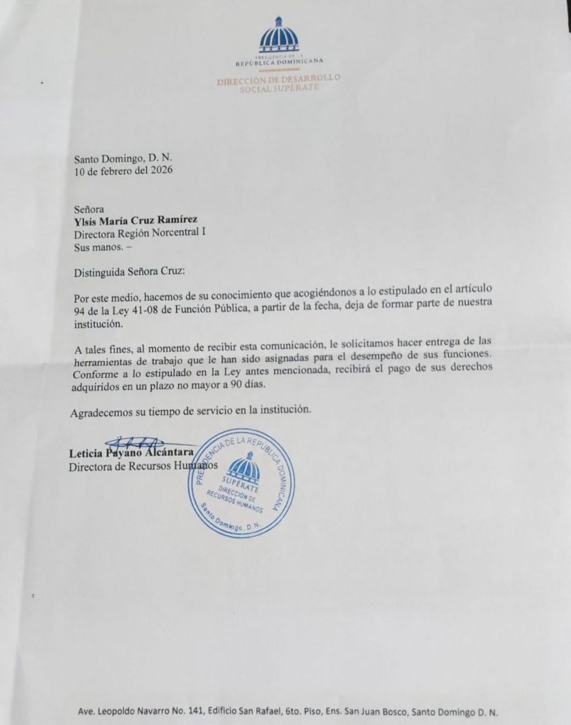 Santiago de los Caballeros.– Fuentes vinculadas al programa social Supérate, así como empleados de la institución, informaron sobre la desvinculación de Ylsis Cruz, reconocida alta dirigente del Partido Revolucionario Moderno (PRM) en la provincia de Santiago.