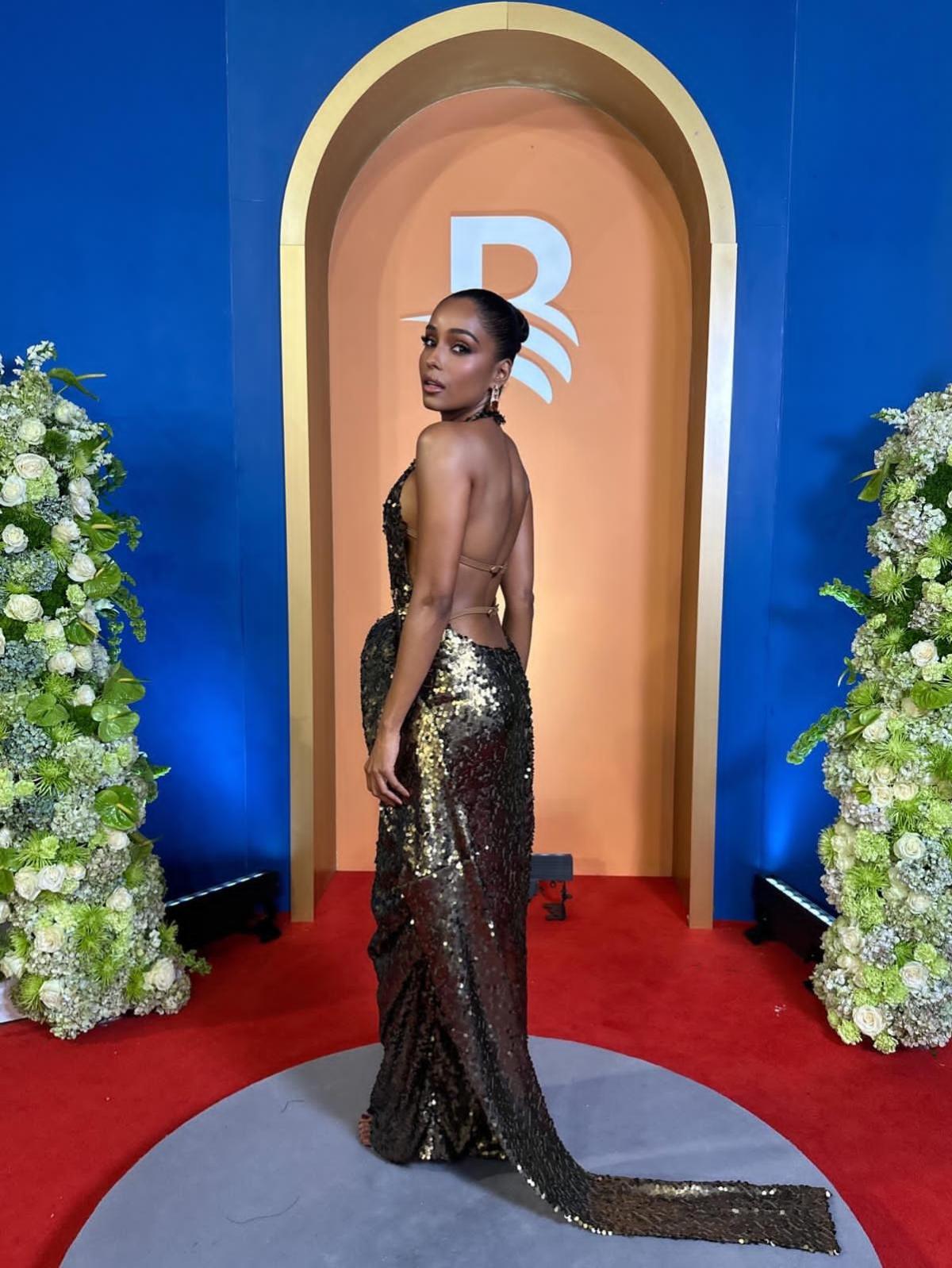 La pieza de pasarela de Luar fue en lentejuelas color cobre, con pañuelo escultural, arco en la cadera y espalda descubierta, con cierres de cinturón, una propuesta muy apropiada para este tipo de eventos.